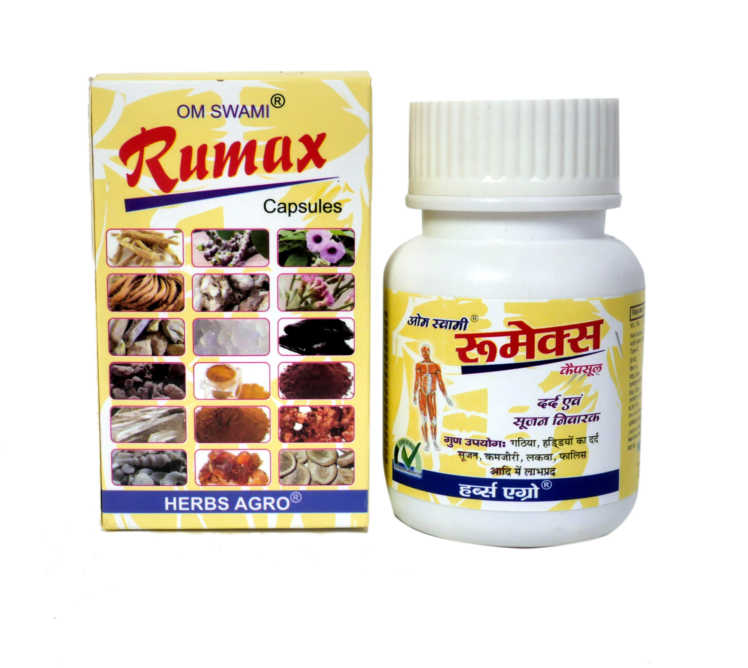 Rumax capsules, which contain a combination of essential natural herbs like Ashwagandha, Giloy, Vidhara, Shatavari, Ginger, Rasna, Turmeric, Chobchini, Shilajit, Vandal Mocha, Samirpannaga Ras, Abhrak Bhasma, Naga Bhasma, Tamra Bhasma, Muktashukti Bhasma, Shudh Guggulu, and Shudh Kuchla: